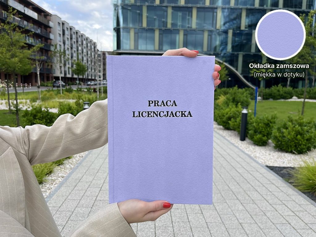 Nie musisz tracić czasu na szukanie drukarni stacjonarnej – zamówienie na wydruk pracy dyplomowej z zamszową okładką możesz złożyć w pełni online na stronie naszej drukarni. Wystarczy kilka minut, aby przesłać plik, wybrać kolor okładki (różowy, liliowy, miętowy lub jasnoniebieski), a my zajmiemy się resztą. Gwarantujemy wysoką jakość wykonania, pełną zgodność z wymaganiami uczelni oraz ekspresową realizację – nawet w 24h.
