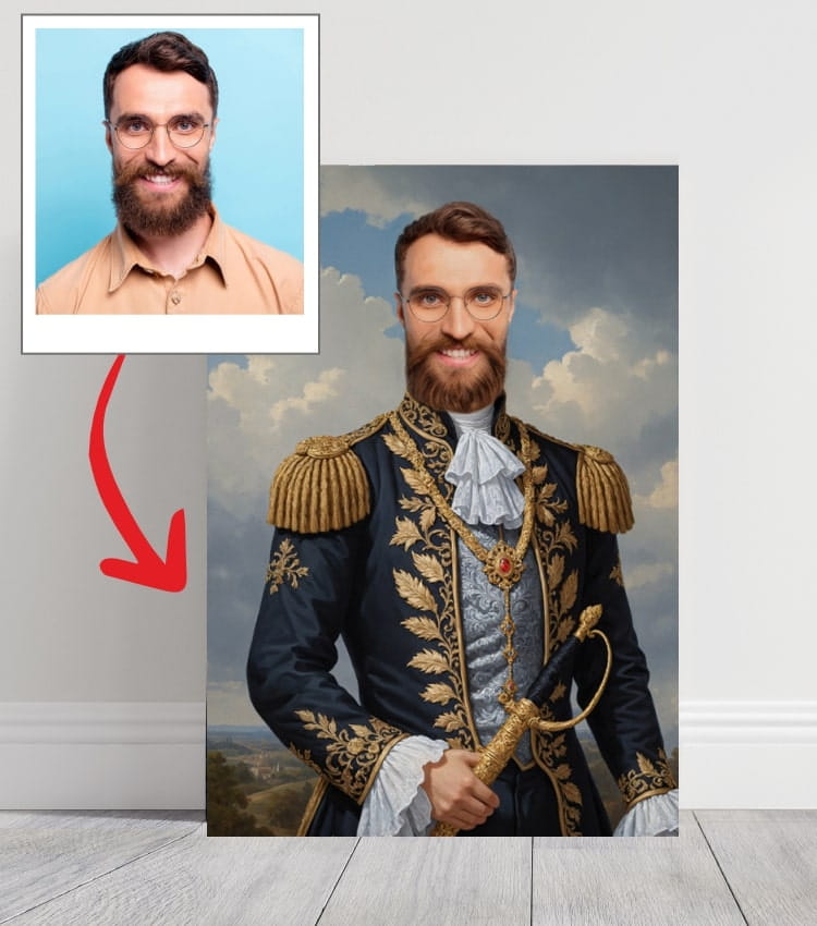 Chcesz poczuć się jak władca z dawnych epok? Portret królewski to wyjątkowa usługa, dzięki której Twoje zdjęcie zamienimy w dostojny, stylizowany obraz inspirowany klasycznym malarstwem. Wybierasz gotową stylizację (król, królowa, arystokrata, dowódca), a my profesjonalnie podstawiamy twarz ze zdjęcia i wykonujemy staranny retusz, aby całość wyglądała naturalnie, realistycznie i elegancko.